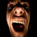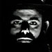 einen schwarz gekleideten Mann mit weit aufgerissen Augen
