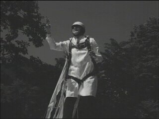 springt per Fallschirm über dem Lager ab ( komisch, die anderen Gäste